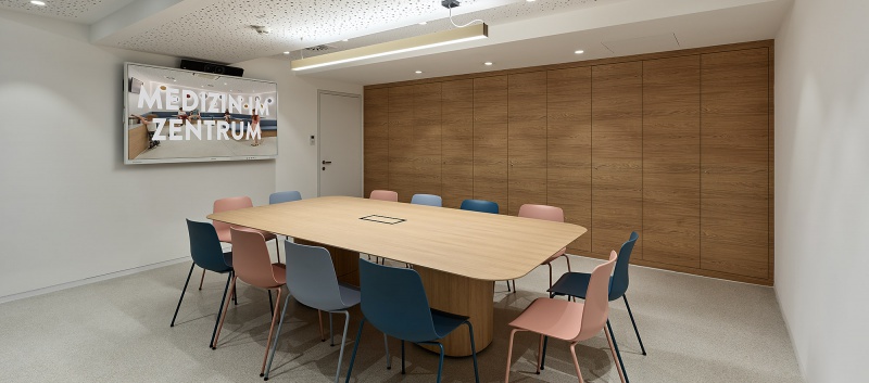 Das ganze Ambiente sollte hell und freundlich sein; neben dem Aufgreifen der hellblauen CI-Farbe, die sich in den Möbeln wiederfindet ziehen sich Holzelemente aus Eiche natur durch das gesamte Gebäude.