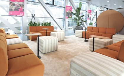 Team Gnesda damit, die sogenannte „Kaffeehausbrücke“ zwischen zwei Gebäudeteilen neu zu gestalten. Entstehen sollte ein lebendiger Treffpunkt – für Besprechungen, Pausen oder für alle, die einmal abseits des eigenen Schreibtisches arbeiten möchten. Das Ergebnis ist ein Mix aus unterschiedlichen Bereichen: klassische Tische und Stühle, ein einladender zentraler Loungebereich, Stehtische mit Barhockern entlang der Fensterfront sowie eine weitere Lounge mit einem schlangenförmigen Sofa und kleinen Bistrotischen. Pflanzen und Akustikelemente schaffen dabei eine klare Zonierung und sorgen für eine angenehme Atmosphäre. Und natürlich wurde auch an die Technik gedacht: Strom- und LAN-Anschlüsse sind überall verfügbar.