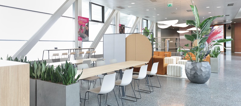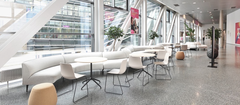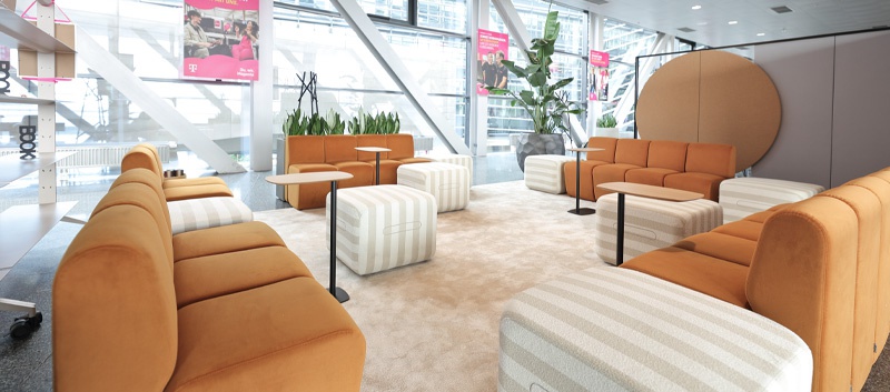 Team Gnesda damit, die sogenannte „Kaffeehausbrücke“ zwischen zwei Gebäudeteilen neu zu gestalten. Entstehen sollte ein lebendiger Treffpunkt – für Besprechungen, Pausen oder für alle, die einmal abseits des eigenen Schreibtisches arbeiten möchten. Das Ergebnis ist ein Mix aus unterschiedlichen Bereichen: klassische Tische und Stühle, ein einladender zentraler Loungebereich, Stehtische mit Barhockern entlang der Fensterfront sowie eine weitere Lounge mit einem schlangenförmigen Sofa und kleinen Bistrotischen. Pflanzen und Akustikelemente schaffen dabei eine klare Zonierung und sorgen für eine angenehme Atmosphäre. Und natürlich wurde auch an die Technik gedacht: Strom- und LAN-Anschlüsse sind überall verfügbar.